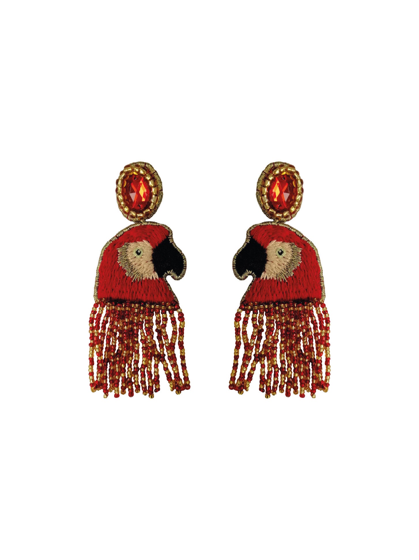 Aretes bordados a mano por artesanas colombianas con mostacillas de vidrio, hilos de algodón y poliéster sobre una base de fieltro. Inspiradas en la especie Ara Macao o llamada también Guacamayo escarlata, Guacamayo Macao y Guacamaya bandera. Se distingue por su plumaje de colores vivos, que es principalmente rojo escarlata, complementado con algunas plumas azules y amarillas con verde que inician desde las alas hasta su cola.